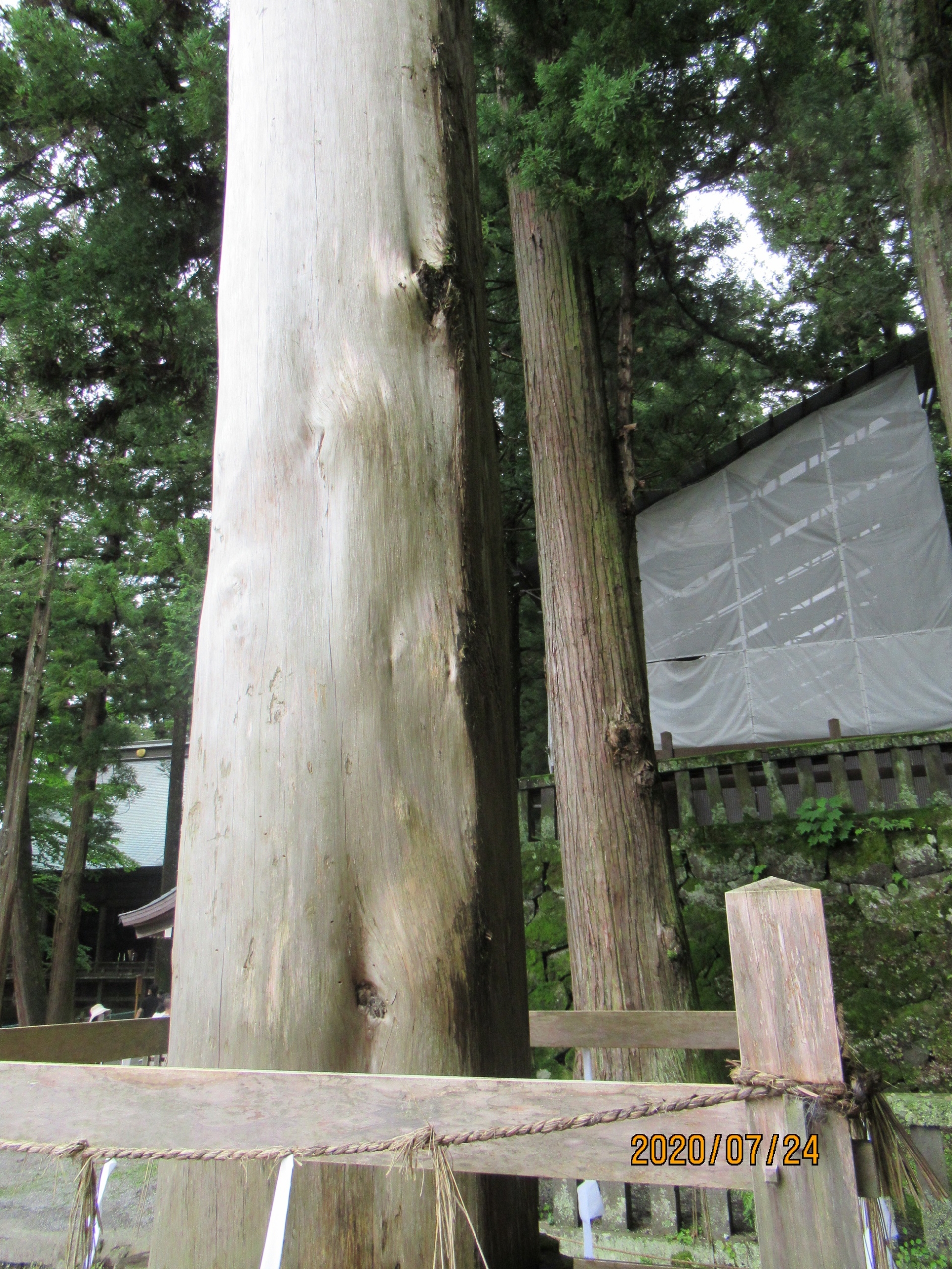 先日、長野の昼神温泉に逗留したついでに諏訪大社を訪問しました。一般的な情報はWEB上にあふれているのでいつものようにカット。新しいトピックスをひとつ、諏訪大社ぐらいの有名な神社には普通「菊の御紋」と「葵の御紋」が飾られてありますが菊の御紋が見当たりません。何かあるなと第六感が働き大社中を探ってみたところありました。諏訪大社は実は明治になる前までは今の五倍ほどの規模の神社仏閣だったのです。そして明治になったころ新政府の方針により神仏分離の原則のもと仏閣の部分が全て取り払われたとのこと、よって当時の五分の一程度に縮小を余儀なくされたとのことです。よって新政府の天皇家に対する恨み??は大きかったと思われます。菊の御紋が飾ってないのは至極当然と言えば当然です。添付写真は例の御柱の一つですが、引きずって大社まで運ぶのでその部分だけすり減って平